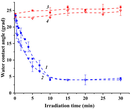 Kinetics of the water contact angle alterations for TiO2 (1, 3) and TiO2/BiVO4 (2, 4) coatings under UV (1, 2) and visible (3, 4) light irradiation. The error on the water contact angle measurement was ±1.5° for all data sets (presented as bars).