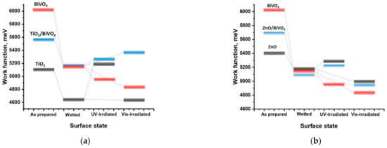 The effects induced by visible light irradiation of the coating surfaces depend on the coating composition. The monocomponent TiO2 and heterostructured TiO2/BiVO4 coatings demonstrate different trends in the alteration of the work function under visible light irradiation. As shown in Figure 3a, the work function of TiO2 practically does not change, while the WF of the TiO2/BiVO4 heterosystem increases. These visible light-driven alterations of WFs correlate with the different Vis-induced hydrophilic behavior of the TiO2 surface for individual and heterostructured coatings (Figure 1).