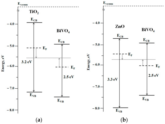 Energy diagrams of the positions of the top of the valence bands and the bottom of the conduction bands and Fermi level positions for TiO2 and BiVO4 (a) and ZnO and BiVO4 (b) heterosystems.