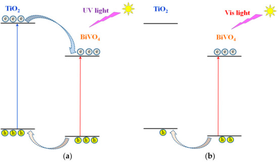Schemes of the electron transfer in heterostructured TiO2/BiVO4 coating under UV (a) and visible (b) light photoexcitation.