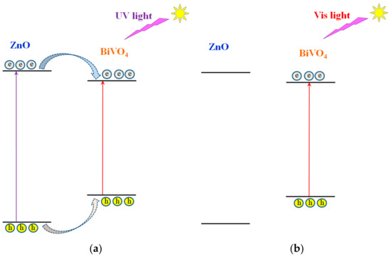 Schemes of the electron transfer in heterostructured ZnO/BiVO4 coating under UV (a) and visible (b) light photoexcitation.