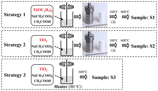 Figure 1 illustrates three fabrication processes for NiO-TiO2 nanoparticles. Strategy 1 (S1) shows a process by using both precursors of NiO and TiO2 (nickel acetate and tetraisopropyl titanate) directly. A nanocrystal of TiO2 covered by NiO clusters can be obtained during a sol-gel process and the following thermal treatment endows the nanocrystal with high crystallinity. This method can generate NiO-TiO2 nanocomposites with low NiO loading according to our previous work [29]. However, this method also leads to a crystal transformation of NiO to form NiTiO3, which has negative effects on photocatalytic hydrogen production [30]. To avoid the formation of NiTiO3, crystalline TiO2 was used to replace its precursor tetraisopropyl titanate in strategy 2 (S2). During a hydrothermal process, nickel ions are only absorbed on a surface of TiO2 rather than penetrated into TiO2 crystal as the high crystallinity of TiO2 inhibits a crystal transformation. NiO-TiO2 nanocomposites with a high dispersion of NiO can herein be obtained after calcination. However, the second strategy can only prepare NiO-TiO2 nanocomposites with a low NiO loading due to a weak electrostatic adsorption ability of a TiO2 surface. Herein, to further improve the loading of NiO, strategy 3 (S3) was employed by directly heating the suspension of TiO2 and nickel acetate followed by calcination. The effects of photocatalyst preparation strategies on NiO loading, a crystal size, a pore size/distribution, and photocatalytic hydrogen production were compared as shown in Table 1. It appears that the samples from S1 have almost the same parameters and performance as those from S2. Higher NiO content endows the samples from S1 and S2 with better photocatalytic hydrogen production. However, further increasing NiO content by S3 causes a decrease in hydrogen evolution.