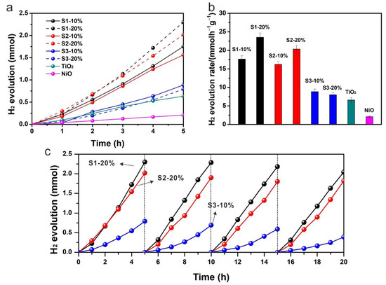 To compare the photocatalytic activities of different nanocomposites, hydrogen production in the presence of methanol as an electron donor was performed. Figure 6a shows the photocatalytic hydrogen production along with reaction time of pure NiO, pure TiO2 and other nanocomposites. All the samples exhibited almost a linear relationship of hydrogen production with reaction time. A small increase in hydrogen production rate could be observed at around 4 h and 5 h reaction, which is mainly due to the self-healing process, i.e., the in-situ reduction of oxidized Ni species to metallic Ni, as very recently demonstrated by operando XAS measurements [31]. The presence of metallic Ni is linked to improved photocatalytic performances. Pure NiO showed a low photocatalytic hydrogen production efficiency due to its p-type semiconductor property. In contrast, n-type TiO2 with electrons as charge carriers showed a relatively higher hydrogen generation rate (6.60 mmolh−1g−1). However, the performance of pure TiO2 was still limited due to a high recombination of photogenerated electrons and holes. Once TiO2 was combined with NiO, the photocatalytic performance was enhanced significantly (23.5 ± 1.2, 20.4 ± 1.0 and 8.8 ± 0.7 mmolh−1g−1 for S1-20%, S2-20% and S3-10%, respectively). Sample S1-20% exhibited the highest photocatalytic hydrogen activity and S2-20% showed a similar hydrogen production efficiency (Figure 6b). However, the samples from strategy 3 showed a much reduced photocatalytic performance, indicating a significant effect of a preparation method on the charge separation efficiency. It has been recognized that a more uniform distribution of NiO on a surface of TiO2 introduces more p-n heterojunction channels for the charge separation, thus leading to a higher photocatalytic performance. Even although the contents of NiO in the composites from strategy 1 and 2 were much lower than those from strategy 3, the enhanced photocatalytic performance revealed the dominant role of p-n heterojunction in improving photocatalytic hydrogen production. S3-10% showed a little higher hydrogen evolution rate than that of S3-20%, which was probably due to the limited light absorption by TiO2 in S3-20% as a high content of NiO with black color competes in light absorption. Cycling tests were performed for each photocatalyst to check its photocatalytic stability. S1-20% and S2-20% exhibited excellent stability during the cycling tests while S3-10% showed an obvious decrease in hydrogen production activity, indicating that high dispersion of NiO stabilizes the composite.