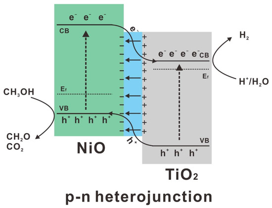 The mechanism of photocatalytic hydrogen production over the as-prepared p-n heterojunction was proposed accordingly (Figure 7). Due to the different Femi levels of NiO and TiO2, the built-in electric field spontaneously drives the spatial separation of photogenerated charges, leading to the band bending at the interface. Under the irradiation of simulated solar light, both NiO and TiO2 are activated to produce electrons and holes. Due to the relative positions of conduction band (CB) and valence band (VB), the photo-activated electrons on the CB of NiO are transferred to the CB of TiO2 and hydrogen is produced at the CB of TiO2 by proton or water reduction reaction. While the photogenerated holes at the VB of TiO2 are transferred to the VB of NiO and then consumed by sacrificial agent methanol. The uniform distribution of NiO leads to efficient formation of p-n heterojunction, thus improve charge separation for photocatalytic hydrogen production. The as-fabricated p-n heterojunction nanocomposites shed new light on the high solar-to-chemical conversion efficiency in a noble-metal free photocatalytic system.