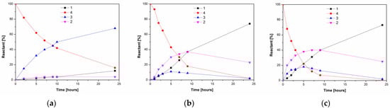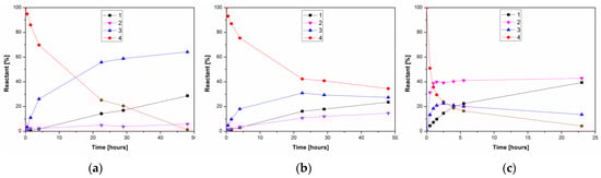 Propanolysis of kojic diacetate in acetonitrile once again almost exclusively produced 3 (Figure 4a), while hydrolysis with 10% water also produced increased amounts of 2 (Figure 4b). On the other hand, hydrolysis in neat water simultaneously produced both monoacetates, with 2 as the major product (Figure 4c). Our results suggest that the organic environment fixes the chemoselectivity of PPL towards the primary acyl of kojic diacetate, while the replacement of water by alcohol is important to suppress formation of the minor byproduct 2. In contrast, the only published report thus far describing the enzymatic deacetylation of kojic diacetate, from Peña-Montes et al. [27], describes the hydrolysis of 4 by two esterases from Aspergillus nidulans. One of these enzymes was selective against the 5-O-acetyl moiety of 4, thereby producing the 7-monoacetate 2.