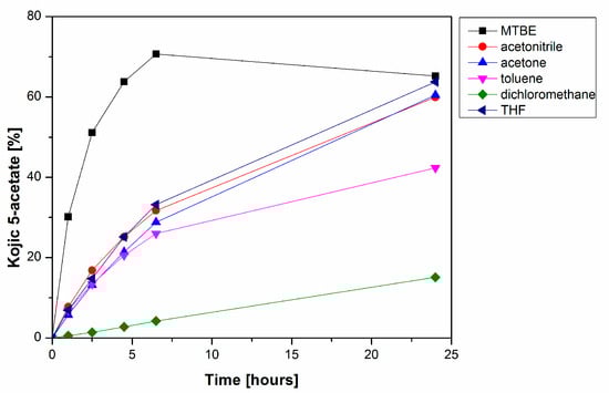 The PPL-catalyzed deacetylation of 4 was further studied in order to achieve higher speed, selectivity and yield of the reaction. Using an organic solvent as a reaction environment can significantly affect the performance of lipases due to the effect of its polarity, potential inhibition of the enzyme or its ability to solubilize substrates and products of the enzymatic reaction. Six solvents (toluene, tetrahydrofuran, acetonitrile, acetone, dichloromethane and MTBE) were tested to find the best reaction media for the deacetylation of kojic diacetate 4. We did not observe any direct relation between the polarity of the solvents used and the productivity of 3, although ethers such as THF and especially MTBE were excellent media for alcoholysis (Figure 3). All reactions in this set of experiments produced only negligible amounts of the undesired 2.