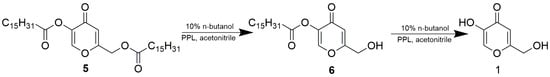 A mixture of 5 (1.72 g), PPL (1.25 g) and 10% n-butanol in acetonitrile (100 mL) was stirred at 37 °C for 4 days, filtered and concentrated by vacuum evaporation. The product was isolated by flash chromatography on silica gel by a gradient of methanol in chloroform. Fractions comprising solely the monoester (as verified by TLC) were combined and concentrated in vacuo to give 0.33 g (31.4%) of kojic 5-palmitate (6). The structure of the product was confirmed by NMR (see Section 3.4. and Supplementary Materials Figures S10 and S11).