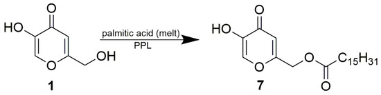 A mixture of 1 g of kojic acid, 3 g of palmitic acid and 1 g of PPL was stirred in a round flask on an alumina nest at 74 °C. After 5 days, an additional 1 g of PPL was added to the melt and the reaction was run for another 5 days, while being monitored by TLC (ethyl acetate/toluene/acetic acid, 1:1:0.1, visualization under UV lamp). The melt was then suspended in chloroform and the enzyme was removed by filtration and washed with chloroform. The filtrate and washings were pooled, concentrated in vacuo and fractionated by flash chromatography on silica gel by a gradient of methanol in chloroform. Fractions comprising solely the monoester (as verified by TLC) were combined and concentrated in vacuo to give 0.79 g (31.7%) of 7. The structure of the product was confirmed by NMR (see Section 3.4. and Supplementary Materials Figures S12 and S13).