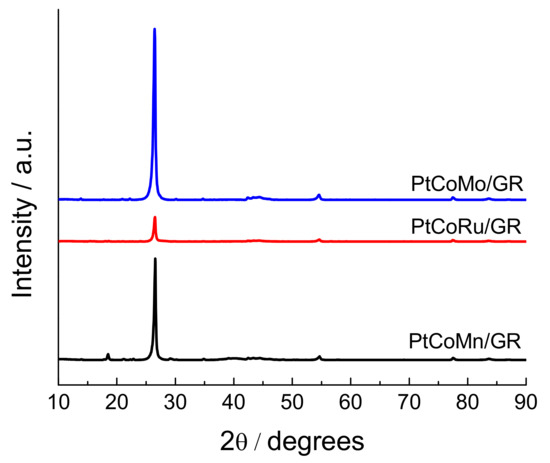 According to the synthesis conditions, using a one-pot microwave synthesis by microwave-assisted heating of Pt(IV), Co(II), Mn(II), Ru(III), and Mo(VI) salts in an ethylene glycol solution, the PtCoMn/GR, PtCoRu/GR, and PtCoMo/GR catalysts were formed. The XRD patterns of the synthesized catalysts are shown in Figure 1. A sharp peak at 26.5° observed for investigated catalysts can be attributed to the graphite structure (002) plane of the supports. For PtCoMn/GR, PtCoRu/GR, and PtCoMo/GR catalysts, the peaks corresponding to polycrystalline Pt and other metals cannot be clearly discerned, because the catalysts are amorphous, and PtCoMn, PtCoRu, and PtCoMo nanoparticles are too small, which results in the broadening of the small peaks.