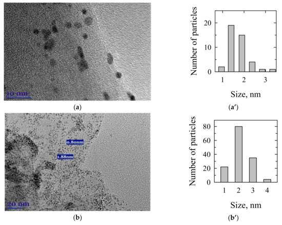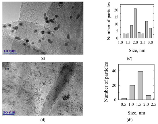 The TEM examination was used to assess the size of reduced Pt nanoparticles in the investigated catalysts. Figure 2 shows TEM images and the corresponding particle size distribution of PtCoMn(1:3:1)/GR (a, a’), PtCoRu(1:2:2)/GR (b, b’), PtCoMo(7:2:1)/GR (c, c’), and Pt/GR (d, d’) catalysts. The particle size distribution was obtained by measuring the diameter of about 50–100 particles found in a randomly chosen area. Spherical and well-dispersed nanoparticles on graphene’s surface for all the investigated catalysts are observed (Figure 2). The average particle size is 1.4 nm for PtCoMn/GR (Figure 2a’) and 2.0 nm for PtCoRu/GR (Figure 2b’) and PtCoMo/GR (Figure 2c’) catalysts. The Pt/GR catalyst with an average Pt nanoparticles size of ca. 1.6 nm was synthesized, as evident from Figure 2d’. Additionally, crystalline PtCoM nanoparticles, i.e., lattice planes, are not observed in HRTEM of Figure 2a–d, which consists of the XRD analysis.