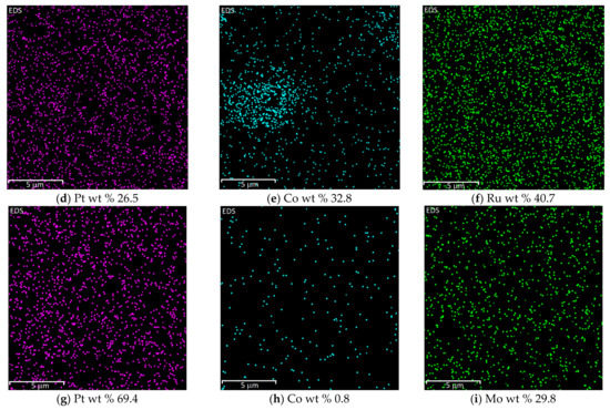 Distribution of metals in PtCoMn(1:3:1)/GR (a–c), PtCoRu(1:2:2)/GR (d–f), and PtCoMo(7:2:1)/GR (g–i) catalysts obtained by EDX analysis.