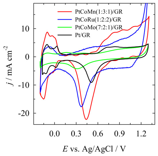 The practical composition of synthesized catalysts was determined by ICP-OES and is given in Table 1. It was found that Pt:Co:Mn, Pt:Co:Ru, and Pt:Co:Mo molar ratios in the prepared PtCoMn/GR, PtCoRu/GR, and PtCoMo/GR catalysts are 1:3:1, 1:2:2, and 7:2:1, respectively. It was determined that Pt loadings in the PtCoMn/GR, PtCoRu/GR, and PtCoMo/GR catalysts were 103.8, 183.2, and 83.8 µg cm−2, respectively. The ESA values of Pt in the catalysts were determined from CVs recorded in the 0.5 M H2SO4 solution and calculating the charge associated with the hydrogen adsorption (220 µC cm−2) and are given in Table 1.