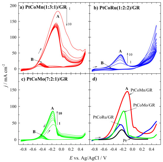 The other way is for the PtCoRu(1:2:2)/GR and PtCoMo (7:2:1)/GR catalysts (Figure 5b,c). Current density values are rising and then stabilized. Figure 5d shows positive-potential going scans of the Pt/GR, PtCoMn(1:3:1)/GR, PtCoRu(1:2:2)/GR, and PtCoMo(7:2:1)/GR catalysts. The highest electrocatalytic activity for methanol oxidation reaction is noted for the PtCoMn(1:3:1)/GR catalyst (Figure 5d).