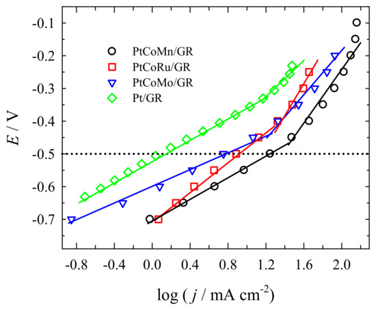 The similar slopes indicate that the reaction mechanism is the same and corresponded to methanol adsorption and dehydrogenation [63]. Notably, PtCoMn/GR, PtCoRu/GR, and PtCoMo/GR catalysts are more active than Pt/GR. The PtCoMn/GR possess the highest output current density among the four electrocatalysts tested in this study under an identical polarization overpotential E = −0.5 V (Figure 7).