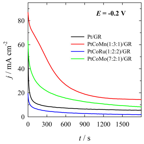 As seen in Figure 8, the investigated catalysts show current decay for the methanol oxidation reaction. However, after approximately 600 s, the current density stabilizes. At the end of the experimental period (t = 1800 s), the current densities recorded at the ternary catalysts are ca. 14, 2, and 8 mA cm−2 for PtCoMn(1:3:1)/GR, PtCoRu(1:2:2)/GR, and PtCoMo(7:2:1)/GR, respectively, and 5.5 mA cm−2 for Pt/GR (Figure 8).