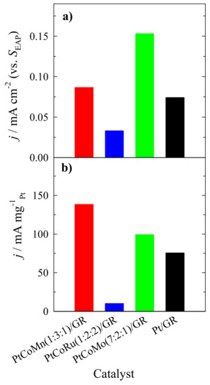 Figure 6 presents the specific (a) and mass (b) activities of the methanol oxidation reaction on Pt/GR and ternary PtCoM/GR catalysts. Methanol oxidation current densities were normalized by electrochemically active surface areas for each catalyst to represent the catalysts’ specific activity. As seen from the data obtained, the highest specific activity has PtCoMo(7:2:1)/GR. It is approximately two times higher than that at PtCoMn(1:3:1)/GR and PtCoRu(1:2:2)/GR catalysts and ca. four times higher than that at Pt/GR (Figure 6a). To obtain the mass activity data, methanol oxidation current densities at the potential values of peak A were normalized by the Pt loadings for the PtCoMn/GR, PtCoRu/GR, PtCoMo/GR, and Pt/GR catalysts (Figure 6b). The highest mass activity for methanol oxidation was calculated for PtCoMn(1:3:1)/GR and PtCoMo(7:2:1)/GR catalysts, and it was ca. 3 times higher than that at Pt/GR and PtCoRu(1:2:2)/GR catalysts (Figure 6b). Those catalysts also show significantly higher mass activity for methanol oxidation over reported similar materials.