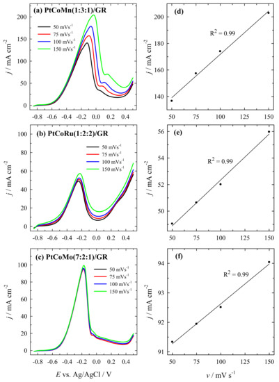 CVs recorded on PtCoMn(1:3:1)/GR, PtCoRu(1:2:2)/GR, and PtCoMo(7:2:1)/GR catalysts in a 1 M CH3OH +1 M NaOH solution at different scan rates of 50–150 mV s−1 (a–c); The relationship between the peak current densities and the square root of the scan rates (d–f).