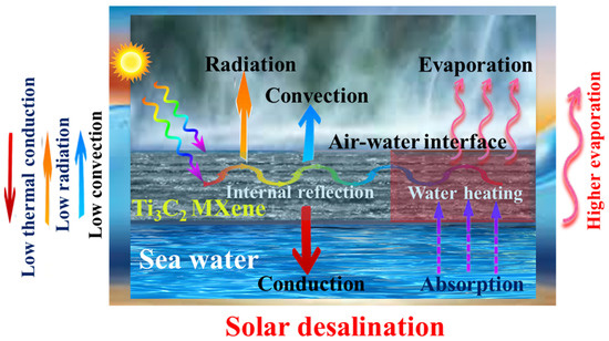 To convert saline seawater into freshwater, the developed photothermal material should overcome three kinds of heat losses: (i) radiation, (ii) convection, and (iii) conduction. Specifically, heat localization is the underlying parameter for advancing the exceptional solar-to-vapor efficiency during the desalination process [34]. All these factors make standalone solar evaporators for productive freshwater generation. For instance, it is necessary to develop a low thermal conductive material to localize the heat at the interface of water–air during the desalination process. At suppressed heat loss toward the bulk water, the localized heat effect significantly improves the steam generation. Figure 2 presents the schematic representation and key factors, which greatly influence the solar desalination by the layer structured 2D Ti3C2 MXenes. Specifically, lowering the thermal conduction, radiation, and convection at improved internal reflection greatly improves the overall water evaporation rate.