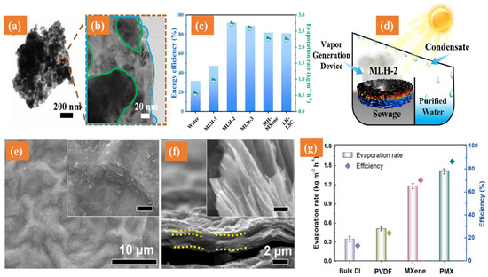(a,b) TEM image and interfacial interaction between Ti3C2Tx MXene nanosheets (blue line) and La0.5Sr0.5CoO3 nanoparticles (green lines), (c) evaporation efficiency of Ti3C2Tx MXene and La0.5Sr0.5CoO3 at different weight ratios, and (d) designed prototype of solar-driven sewage purification system (Reprinted from Ref. [18], copyright with permission from Elsevier, 2021), (e,f) top and cross-section view of Janus PMX membrane, and (g) evaporation rate and efficiency of Janus PMX membrane compared to base components (reprinted from Ref. [57], copyright with permission from American Chemical Society, 2021).