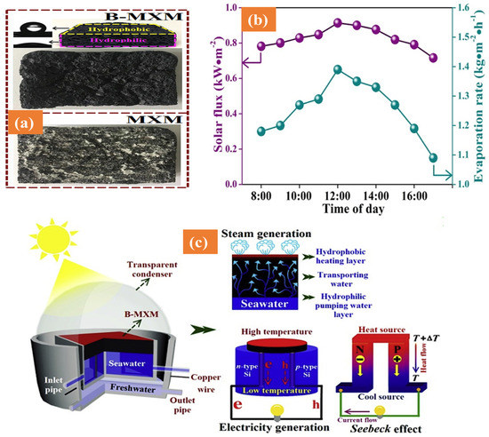(a) Hydrophobic/hydrophilic bilayers of Ti3C2 MXene-based monolith with heat localization by hydrophobic nature, (b) corresponding evaporation rate at various time and solar intensities, and (c) implementation of simultaneous solar desalination and voltage measurements through temperature difference, using hydrophobic and hydrophilic Ti3C2 MXene layers (reprinted from Ref. [20], copyright with permission from Elsevier, 2020).