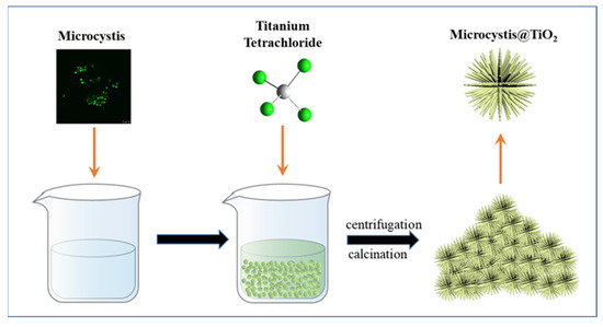 Five mL 107 cells/mL Microcystis solution was washed by phosphate buffer saline three times. The above solution was dispersed in 80 mL deionized water in an ice bath for 30 min and the pH of the solution was adjusted to 4.0. 2 mL tetrabutyl titanate (TiCl4) with a concentration of 1 mol/L being added and slowly stirred for 24 h at room temperature. The mixture was heated to 70 °C and stirring was maintained for 2 h. The yellow-white precipitate was collected and dried at 60 °C overnight. Finally, the product was transferred into a muffle furnace and calcined at different temperatures (400 °C, 450 °C, 500 °C, 550 °C, 600 °C, 650 °C, 700 °C, 750 °C, and 800 °C) for 2 h to remove Microcystis cells and make proper carbon doping. The obtained Microcystis@TiO2 composites were named Microcystis@TiO2-400, Microcystis@TiO2-450, Microcystis@TiO2-500, Microcystis@TiO2-550, Microcystis@TiO2-600, Microcystis@TiO2-650, Microcystis@TiO2-700, Microcystis@TiO2-750, and Microcystis@TiO2-800, respectively.