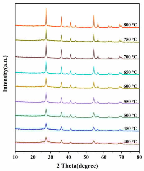 TiO2 has three different polymorphic phases: the rutile phase, anatase phase, and brookite phase. The rutile phase is the most thermodynamically stable phase among these three natural phases of TiO2. The applications of the rutile phase is wide, because of its unusual properties, such as high optical, high chemical stability, high dielectric constant, and good scattering efficiency. The schematic preparation process of the samples is displayed in Figure 1. Microcystis solution was dispersed in 80 mL deionized water under ice bath and the pH of the solution was adjusted to 4.0. After stirring for 30 min, 2 mL 1 mol/L tetra butyl titanate (TiCl4) was added slowly under an ice bath and stirred for 24 h at room temperature. Then, the mixture was heated at 70 °C and kept stirring for 2 h. The yellow-white precipitate was collected and dried at 60 °C overnight. Finally, the obtained product was calcined in a muffle furnace to remove Microcystis aeruginosa and make proper carbon doping. The structure and morphology of the obtained samples were analyzed by using X-ray diffraction (XRD), scanning electron microscopy (SEM), and transmission electron microscopy (TEM). Figure 2 shows the XRD patterns of the samples. The patterns of the samples calcined under different temperatures matched well with the rutile phase (JCPDS no. 21–1276). The peaks around 27.4°, 36.1°, 41.2°, 54.3°, 56.6°, and 69.0°corresponded to the (110), (101), (111), (211), (220), and (301) crystal planes of rutile TiO2, respectively. The Microcystis@TiO2-400 exhibited weak XRD peaks, which related to its low crystallinity. With the rise of calcination temperature, the diffraction intensity increased and the crystal characteristics of rutile TiO2 became more defined. Figure 3 and Figure 4 are the SEM and TEM images that were used to analyze the morphology of the samples. As depicted in Supplementary Materials Figure S1, the sample without calcination was surrounded by many spheroidal particles. After calcination, the morphology of the spheroidal particles was greatly different, as the thin rutile rods were in-situ grown on the surface during the calcination process. As shown in Figure 3a–d, the Microcystis@TiO2-550 possesses a sea urchin-like morphology with a diameter of about 5 μm. When calcined at 800 °C, the end of the nano rod became sharper, indicating that the crystalline increased.