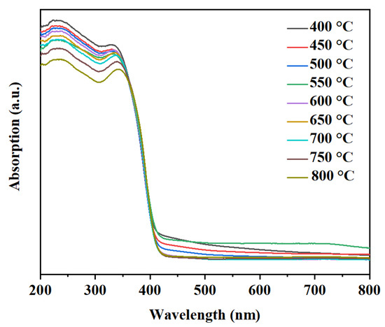 UV–Vis diffuse reflectance spectra (UV–Vis DRS) was conducted to investigate the optical properties. As shown in Figure 6, all samples had an obvious absorption band in the ultraviolet region. Microcystis@TiO2-550 processes an increased absorption capability in the visible region compared with other samples, which is related to the carbon introduced from Microcystis. The Microcystis@TiO2-550 and Microcystis@TiO2-800 were selected as the representative samples for calculating the optical bandgap. According to the Kubelka-Munk function vs. light energy shown in Supplementary Materials Figure S4 in supporting information, the bandgap energy of Microcystis@TiO2-550 was calculated to be 2.91 eV, which was smaller than that of Microcystis@TiO2-800 (3.0 eV). The smaller bandgap could be attributed to the progress of calcination, which caused the different quantities of element doping, especially carbon-doping.