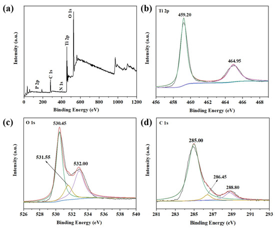 (a) XPS spectra of Microcystis@TiO2-550 and the corresponding high-resolution spectra of (b) Ti 2p, (c) O 1s, (d) C 1s.