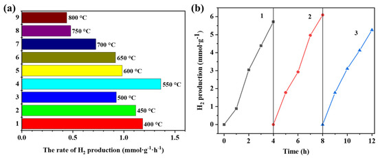 The photocatalytic hydrogen generation performance was assessed by using a Xe lamp in a Pyrex reactor for H2 production as well as methanol as an electron donor. The results are presented in Figure 9. With the prolongation of the irradiation time, a linear increase of H2 amount can be observed in the Microcystis@TiO2 samples (Figure S8 in the Supplementary Materials). With the increase in calcination temperature from 400 to 500 °C, the rate of hydrogen evolution decreased. When the calcination temperature continuously increased to 550 °C, the hydrogen evolution rate reached a maximum. However, the rate of hydrogen evolution continuously decreased, with a further rise in the calcination temperature from 550 to 800 °C. The hydrogen generation rate is 1.36 mmol·g−1·h−1, which was three times higher than that of Microcystis@TiO2-800 sample. The Microcystis@TiO2-550 showed the optimal photocatalytic activity, indicating that the carbon doping was the key factor affecting the photocatalytic activities. The stability of the Microcystis@TiO2-550 for hydrogen production was also evaluated and the results were displayed in Figure 9b. After three-time cycling reaction operation, there was no noticeable decrease of photocatalytic H2 evolution, which indicated good photocatalytic stability of Microcystis@TiO2 composites. It is attributed to Microcystis@TiO2 photocatalysts with active exposed surfaces, voids, which provide more catalytic active sites to promote photocatalytic hydrogen production by accelerating the charge transfer. In summary, the reusable characteristic of Microcystis@TiO2 possessed potential value for photocatalytic reduction applications, such as H2 production and nitrogen fixation.
