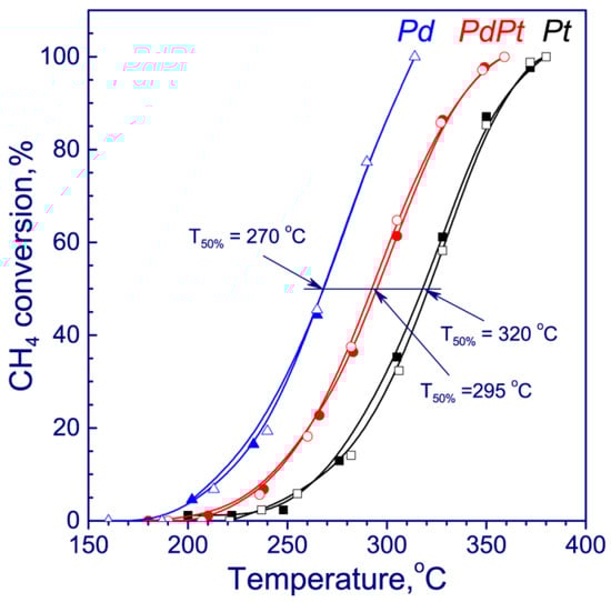 The oxidation of methane was studied over Pd/Al2O3, Pt/Al2O3 and bimetallic PdPt/Al2O3 catalysts in the temperature range of 150–400 °C. Only CO2 and water were detected as products of the oxidation of methane for all the catalysts. To compare the catalytic activity of the catalysts under study, the temperature dependences of the methane conversion were measured. Then the light-off temperature (the temperature of reaching 50% of the methane conversion, T50) was determined for each catalyst. The results are presented in Figure 1. One can see that the monometallic Pd catalyst demonstrates the highest catalytic activity, and the light-off temperature is approximately 270 °C. The monometallic Pt catalyst has the lower catalytic activity and T50 achieves 320 °C. As was expected, the bimetallic PdPt/Al2O3 catalyst has intermediate catalytic activity and T50 equals to 295 °C. The differences in the catalytic activity of monometallic catalysts could be obviously explained by the higher activity of palladium than platinum in the total oxidation of methane [14,16,24,29]. We believe that the activity of supported catalyst correlates with the structure of the active component, as it was mentioned above that the bimetallic catalysts could have different structures of active species. It could be separate palladium and platinum nanoparticles, alloyed nanoparticles, core-shell nanoparticles, etc. For each type of structure of active species, the catalytic behavior could be different, and some synergetic effect could be expected. The correct explanation of the catalytic activity should be based on the overall information about the atomic structure of the active component.