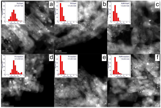 HAADF STEM micrographs of the Pd/Al2O3 (a,d), Pt/Al2O3 (b,e) and bimetallic PdPt/Al2O3 (c,f) catalysts before (a–c) and after using in the oxidation of methane (d–f). For each samples the particle size distribution is presented.