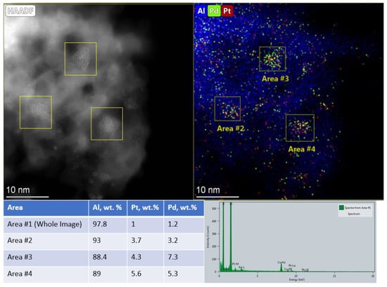 To prove that the synthesized bimetallic PdPt/Al2O3 catalyst does not contain separated monometallic palladium and platinum nanoparticles, EDX analysis was performed. The EDX mapping of the distribution of palladium and platinum atoms is presented in Figure 3. The EDX analysis indicates that palladium and platinum are locally concentrated throughout the support and the areas of local concentration are similar for palladium and platinum. This means that the synthesis modes allow us to prepare the alloyed PdPt nanoparticles supported on Al2O3. The EDX analysis of the catalyst after the reaction reveals that the reaction conditions do not change the bimetallic composition of PdPt nanoparticles. The EDX mapping of the distribution of palladium and platinum atoms of the catalyst after reaction is presented in Supplementary Figure S1.