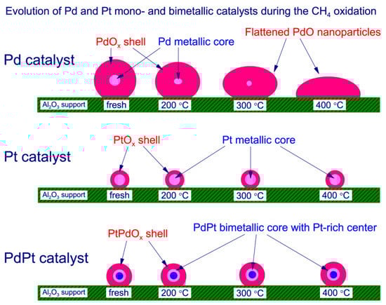 Proposed models of evolution of Pd/Al2O3, Pt/Al2O3 and bimetallic PdPt/Al2O3 catalysts during the oxidation of methane.