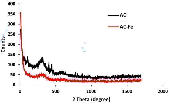 The XRD diffractograms of the AC-Fe and AC materials are shown in Figure 1. The centralized extended signal at 25° confirmed the presence of amorphous carbon. This peak was observed for AC and AC-Fe, suggesting no difference in the structures of AC and AC-Fe. This result can be explained by the low amount of Fe in AC, indicating that the AC structure was not altered by Fe incorporation. In addition, iron impregnated into AC was in the amorphous phase [21] (Figure 1).