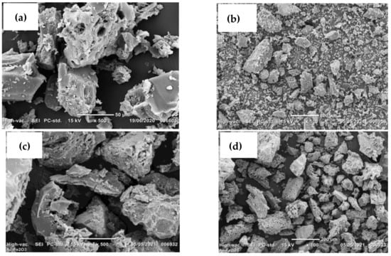 SEM images of different adsorbents based on activated carbon. (a,b), AC; (c,d), AC-Fe.