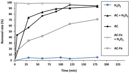 TBO removal upon treatment with AC and AC-Fe in the presence and absence of H2O2. Experimental conditions: pH = 3.5, [TBO]0 = 50 mg/L, [H2O2] = 4 mmol/L, [AC-Fe] = 1.2 g/L, reaction temperature = 20 °C.