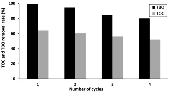 Catalyst reuse is a crucial factor and an important point to be considered for the practical application of each catalyst material. The catalyst based on AC-Fe was evaluated on TBO degradation under normal conditions during the consecutive runs. As shown in Figure 11, the proposed catalyst retained 80% of the TBO degradation efficiency after four cycles. These results confirm the good stability and reutilization of the prepared AC-Fe catalysts. A slight decrease in catalyst efficiency was observed after the fourth cycle, attributable to the difficulty in completely removing the reaction residues and intermediates bound to the active site of the catalyst after the reaction. In addition, TOC measurements demonstrated a gradual decrease (from 64% to 52% TOC) when the number of cycles increased (Figure 11). Consequently, the AC-Fe catalyst can be considered as a recyclable and stable material for water treatment via the Fenton-like reaction.