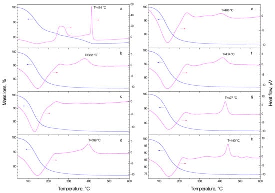 TGA (left axis) and DTA (right axis) measurements of as-synthetized V-TiO2 samples with 0 (a), 0.5 (b), 1 (c), 2 (d), 5 (e), 7 (f), 10 (g) and 20 (h) mol% vanadium content.