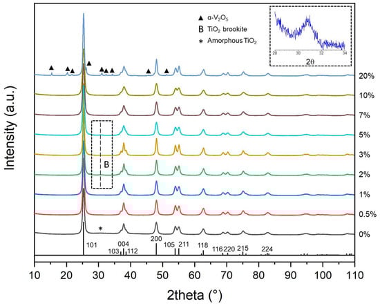 A very limited number of TGA-DTA measurements of V-TiO2 mixed oxide materials exist in the literature. The most relevant one to our studies has been published by Shao et al. [39] who synthetized V-TiO2 powder via sol–gel method. They have reported in V-TiO2 powder with 5.8 mol% V the principal mass loss due to the solvent/water desorption below 300 °C associated with endothermic heat flow followed by a broad exothermic band with the maximum at ~250 °C due to the residual organics burning, which are in agreement with our results. A broad exothermic peak associated with the material crystallization between 380 and 560 °C has been observed in these studies, which merged together anatase, brookite and rutile phase transitions. Unfortunately, no detailed analysis of samples with different vanadium content has been presented in the earlier studies. The well-resolved exothermic crystallization peak observed in our studies, which shifted with an increase in the vanadium content (see Figure 1), was attributed by us to the phase transition in size-selected V-TiO2 nanoparticles (see, e.g., [36]).