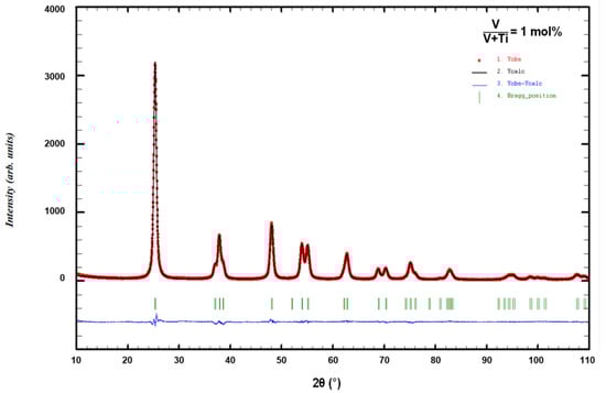 In order to obtain more precise structural and microstructural information, Rietveld refinement of the XRD patterns was performed. A typical result of the fitting procedure for the sample with 1 mol% V, shown in Figure 3, confirms anatase crystalline structure of the formed lattice.
