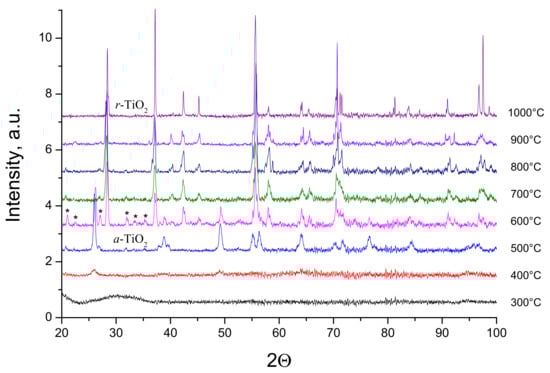 In order to follow crystallization of the material with the highest level of vanadium, close to the solubility limit, we performed XRD measurements on 20 mol% V probes treated with different temperatures from 300 to 1000 °C during 4 h. The results are shown in Figure 4. The XRD patterns after heat treatment temperature below 400 °C showed an amorphous state of V-TiO2 material. At 400 °C, broad peaks attributed to the TiO2 anatase phase were observable, attesting that the crystallization process is underway. However, the sample remains poorly crystallized. At 500 °C we observed the anatase phase related to TiO2, which transformed to pure rutile at 700 °C and higher temperatures. In the same time, we observed many peaks of a smaller intensity at 600 °C (a very weak contamination of XRD patterns by these peaks can be noticed after heat treatment with 500 °C and 700 °C). These peaks more probably belong to the orthorhombic α-V2O5 phases, which would indicate the material segregation at intermediate heat treatment temperatures; in contrast, a perfect dissolution of vanadium in anatase and rutile titania takes place at, respectively, lower and higher temperatures. Alternatively, these peaks may be due to a metastable VxTiyOz solid, which decays after its formation at high temperatures. More work is required to understand their origin.