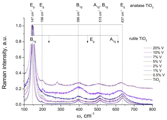 The Raman spectra of V-TiO2 samples with different vanadium content, calcinated at 450 °C for 4 h are shown in Figure 5. The spectra with 0, 0.5, 1, 2, 5 and 7 mol% V showed frequencies of the bands maximum at 147 cm−1 (Eg), 198 cm−1 (Eg), 396 cm−1 (B1g), 515 cm−1 (A1g/B1g) and 637 cm−1 (Eg), which correspond to anatase TiO2 in agreement to literature [42]. In the same time, samples with 10 and 20 mol% V showed significant deviations: the band at 515 cm−1 weakened while the bands at 396 cm−1 and 637 cm−1 shift, respectively, to high and lower frequencies and new bands appeared at 280 cm−1, 300 cm−1 and 690 cm−1. These modifications correspond to the short-range structural rearrangements. We notice that according to the XRD pattern in Figure 2, TiO2 with 20 mol% V after calcination at 450 °C contained a small amount of orthorhombic phase of V2O5, which could explain for these modifications [43].