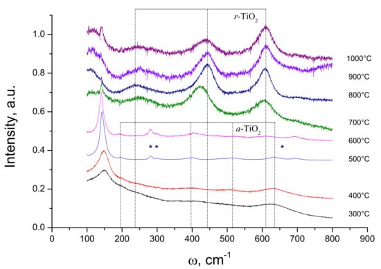 The Raman spectra of V-TiO2 samples with 20 mol% V heat treated at different temperatures are shown in Figure 6. These samples were calcinated at temperatures star-ting from 300 °C to 1000 °C every 100 °C making a total of 8 samples of 20 mol% vanadium. The positions of bands in samples calcinated at 300 °C, 400 °C and 500 °C correspond to anatase TiO2, while those of samples calcinated at temperatures above 700 °C to rutile TiO2. In contrast, samples heat treated at 500 °C, 600 °C and 700 °C showed more complex spectra. In particular, three new unassigned bands appeared at 281 cm−1, 300 cm−1 and 696 cm−1, which can be connected to the unassigned XRD peaks in Figure 4. We notice in this connection, that Ren et al. [24] have observed in V-TiO2 a weak peak in the frequency range ~280 cm−1 attributed to V2O5 with an increased vanadium contents up to 5 and 10 mol%; however, the applied method did not guarantee perfect V element dispersion in the host matrix, which may result in the vanadium oxide clustering at the high elemental content. On the other hand, segregation of titania and vanadia materials at intermediate temperatures of ~600 °C seems unlikely in our preparation conditions. More work is required to understand the new phase appearance.