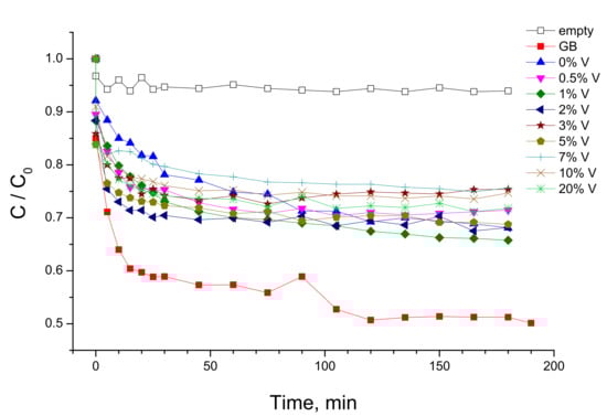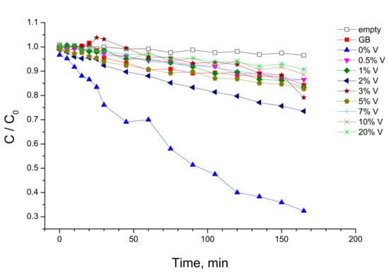 MB adsorption measurements with UVA lamp “off” using uncoated and V-TiO2 coated glass beads (GB). Adsorption curve in empty reactor is also shown. Vanadium content is indicated in mol%.
