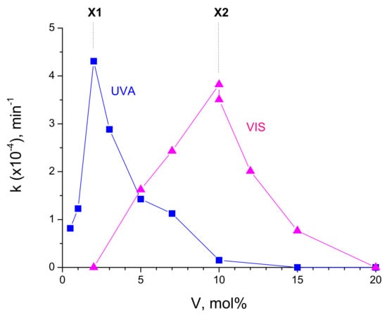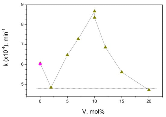 The experimental data in Figure 10 followed the first-order kinetics and, by analogy with the UVA photocatalytic data (see Section 2.2.1), were linearly fitted in semi-logarithmic frame to obtain the reaction rate constants k (in min−1). These k values are presented in Figure 11 as a function of vanadium content in the photocatalyst.