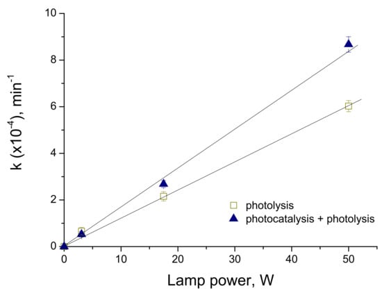 In order to clear up the nature of material activity, we underwent the measurements of the photocatalytic kinetics with different intensities of the visible lamp illumination. These series were completed with different lamp powers for V-TiO2 coatings with 10 mol% V content. The resulting dependence of the photocatalytic rate constants in empty reactor (photolysis) and in reactor filled with V-TiO2 coated glass beads (photocatalysis) on the visible lamp power is shown in Figure 12.