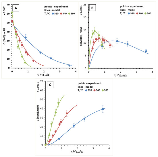 Calculated and experimental dependencies of the concentrations of DME (A), methanol (B), and water (C) on specified contact time at T = 320–360 °C. Catalyst Mg-HZSM-5/Al2O3.