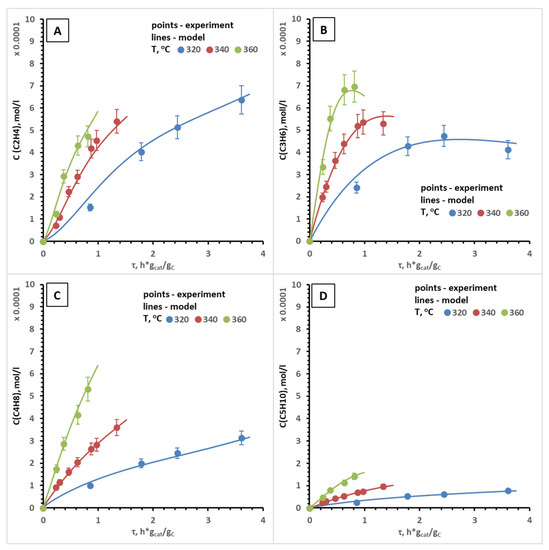 Calculated and experimental dependencies of the concentrations of ethylene (A), propylene (B), butenes (C) and pentenes (D) on specified contact time at T = 320–360 °C. Catalyst Mg-HZSM-5/Al2O3.