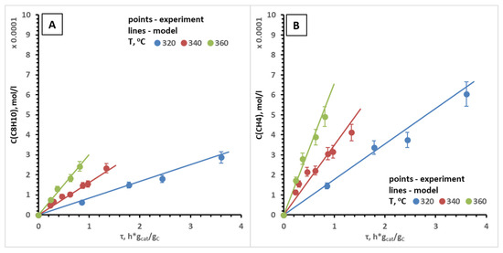 Calculated and experimental dependencies of the concentrations of aromatics C8H10 (A) and methane (B) on specified contact time at T = 320–360 °C. Catalyst Mg-HZSM-5/Al2O3.