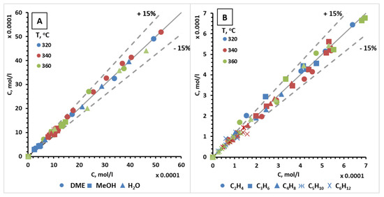 Correlation plots of experimental and calculated concentrations of oxygenates and C2–C6 olefins (the most significant components) for Mg-HZSM-5/Al2O3 are given in Figure 6, for other components—in Figure S7. Taking into account the error of the experiment (10%), we accepted and indicated on correlation plots the possible deviation of the model results from the experimental data—15%.